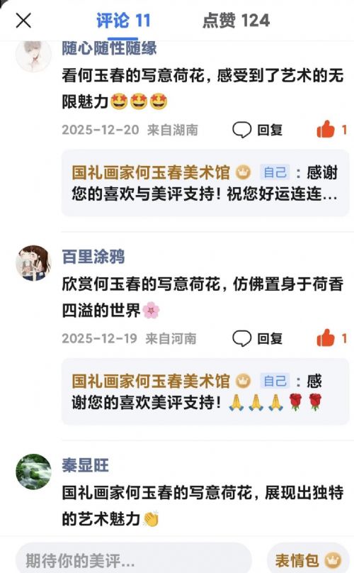 从评论区的专业视角看,何玉春的艺术魅力体现在三个维度:其一,技法之妙——“细腻入微的层次感”(《胡琼》评)与“恰到好处的色彩搭配”(《得就德》评),展现了扎实的传统功底;其二,意境之深——“每一笔都彰显艺术魅力”(《super@雪》评),在“写意”中融入诗性,让画面“如散发淡淡香气般吸引眼球”(《hhf》评);其三,精神之核——以荷花为载体,传递“心如莲花”的纯净力量,正如“老东西”所言,让人“忘却尘世俗事”,在艺术中找到心灵的栖息地。